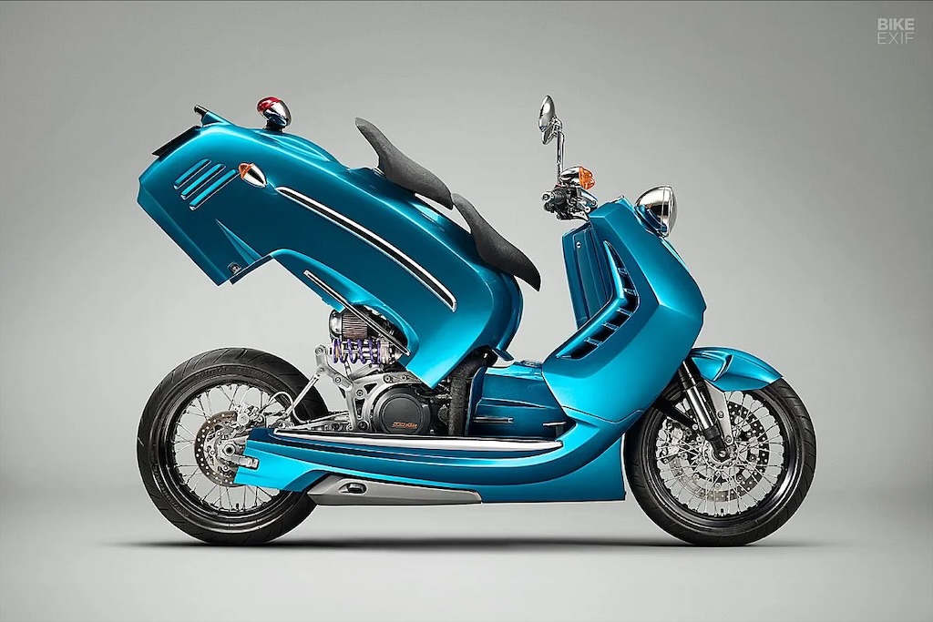 Kali ini, ia menciptakan sebuah skuter kustom yang berbasis dari mesin performa tinggi milik KTM.